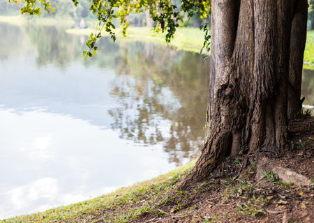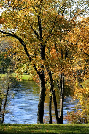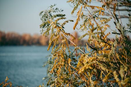 Autumn landscape with lake and trees with golden leaves. Selective focus. Copyspace.