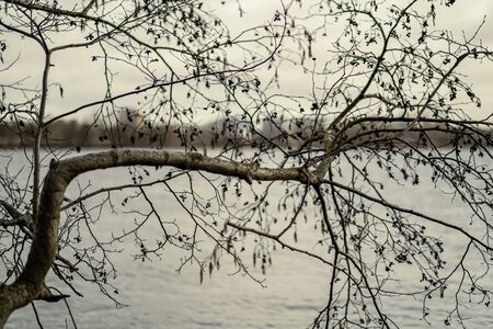 shore of a large lake with grass and trees growing on the shore without foliage, landscape