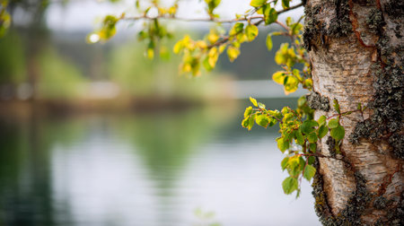 A serene lakeside view featuring vibrant spring foliage, a luminous birch tree, and gentle ripples under a soothing daylight in a quiet natural landscape.