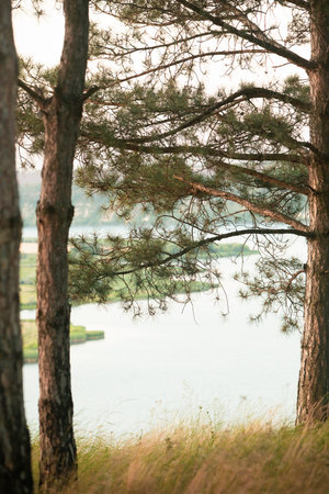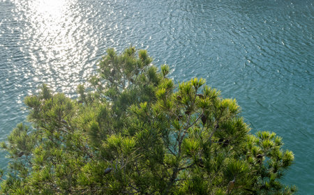 Pine branches on blue lake. Coniferous forest on shore of turquoise sea