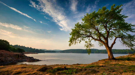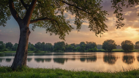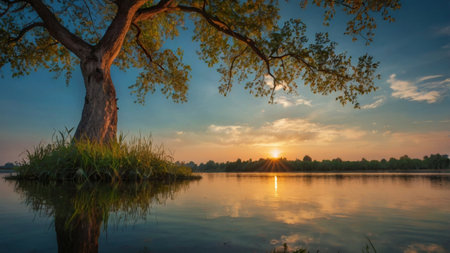 A serene scene unfolds as gentle sunlight shines through the leaves of a tree, casting a warm glow. The tranquil riverbank invites relaxation as nature awakens at dusk.