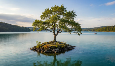 misty morning nature landscape view tree above water smooth peaceful surface atmospheric spring time season