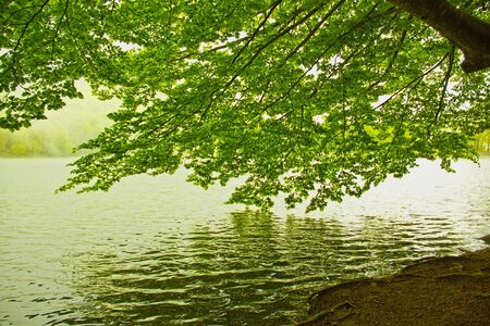 Yellow autumn tree with leaves near the lake and forest in background on Sf Ana lake, Romania