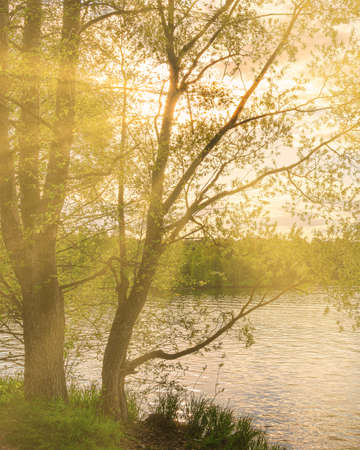 Summer landscape, trees on the bank of the river lit by the setting sun