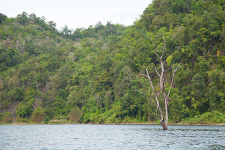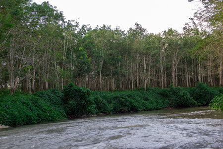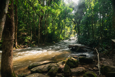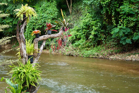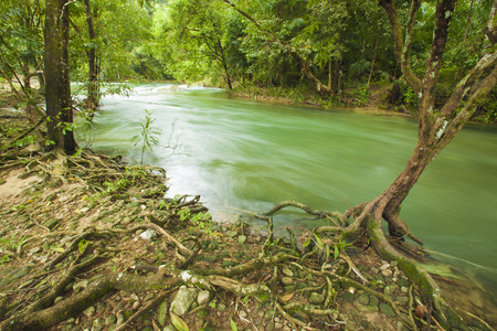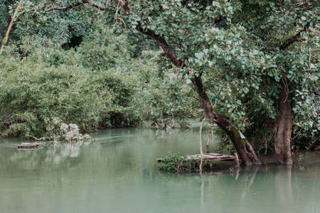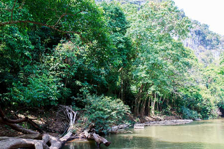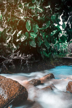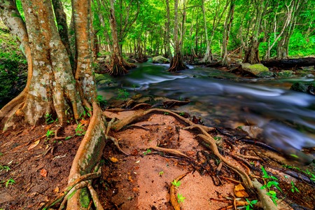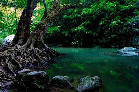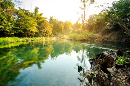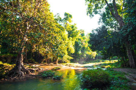 Green tree in Thailand, river flowing in the forest, environment concepts and background.
