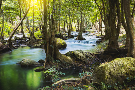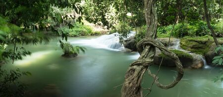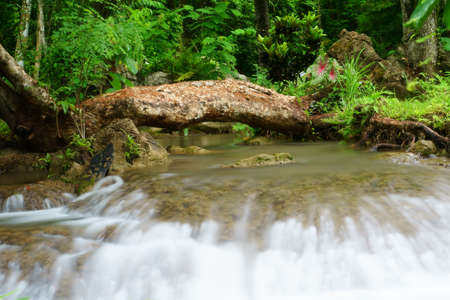 clear water stream or waterfall with tree and log or timber in green jungle or forest and garden for summer holiday relax and travel vacation with trekking trip at kroeng krawia in national park