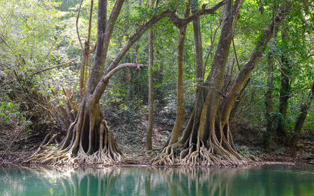 Scenic mangrove forest ecosystem with Mangrove roots and blue water at Krabi, Thailand.