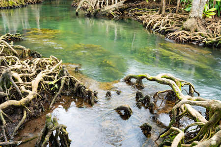 Tropical tree roots or Tha pom mangrove in swamp forest and flow water, Klong Song Nam at Krabi, Thailand.