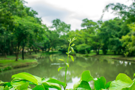 A beautiful clear lake with green forest background, camping holiday and travel concept .