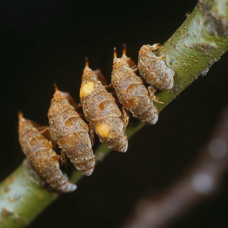 A group of small brown insects rests on a green branch in a vibrant tropical forest. The warm evening light enhances their intricate textures and the surrounding foliage.