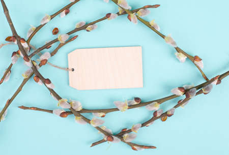 Easter holiday background, nest with small eggs, branches of pussy willow, greeting card, spring season, blue color, copy space for text
