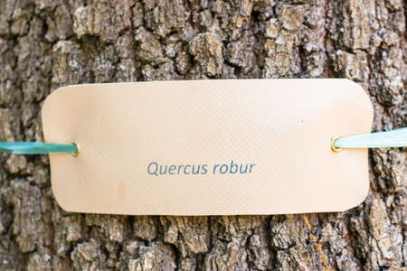 species nomenclature label on the trunk of an oak