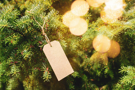 Empty price tag hanging on Christmas tree with nice bokeh