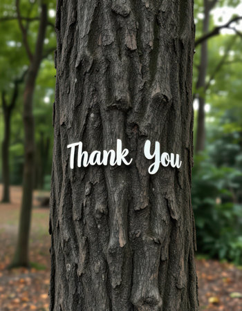 Expressions of gratitude displayed on a tree trunk in a serene park setting during autumn foliage