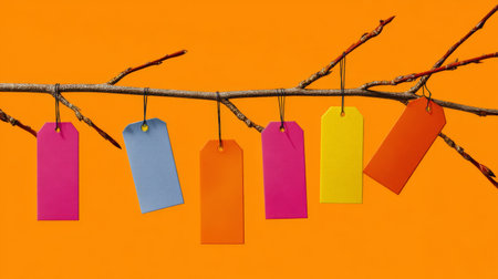 Colorful tags hanging from a branch against a bright orange background in a simple yet vibrant display