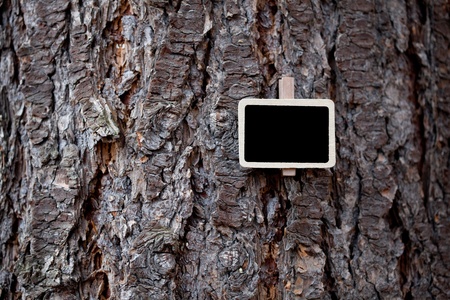 blackboard attached to a background of tree bark