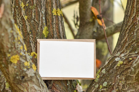 Vintage empty paper stands on green leaves of a plant near tree, creating a rustic and natural background. The weathered sheet blends with botanical foliage, offering an eco-friendly texture