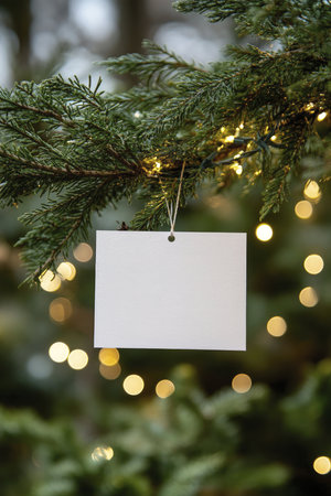 A simple blank card mockup hangs from a Christmas tree, surrounded by soft lights and lush greenery. Ideal for festive designs and creative holiday projects.