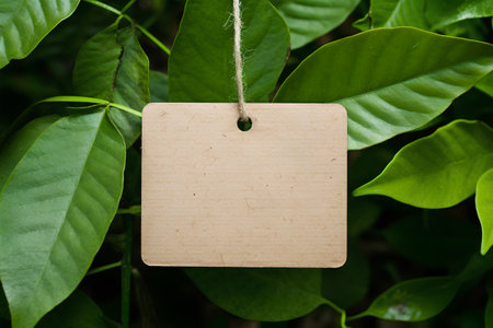 Blank paper tag hanging on green leaves background. Mock up.