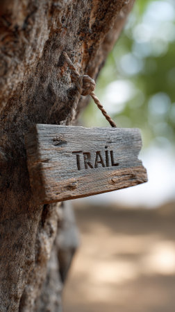 Wooden trail sign indicating the beginning of a hiking path, hanging on a tree trunk in a natural park or campground, invites exploration and adventure during summer travel