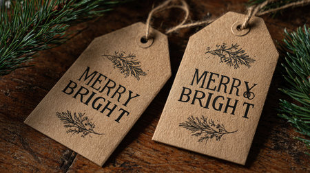 Beautiful rustic holiday gift tags featuring the phrase Merry Bright and elegant greenery design, perfect for festive gift wrapping and decoration.