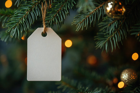Blank white gift tag with twine bow hanging on a green Christmas tree with bokeh lights