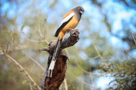 Rufous treepie (Dendrocitta vagabunda) sitting on a dry branch