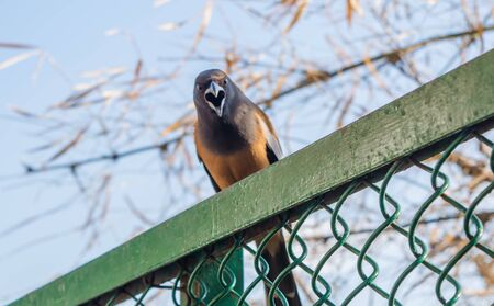 The rufous treepie (Dendrocitta vagabunda) sitting on branch and screaming, native to the Indian Subcontinent, wildlife bird photography, clear background