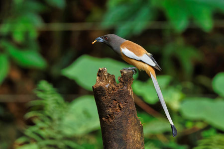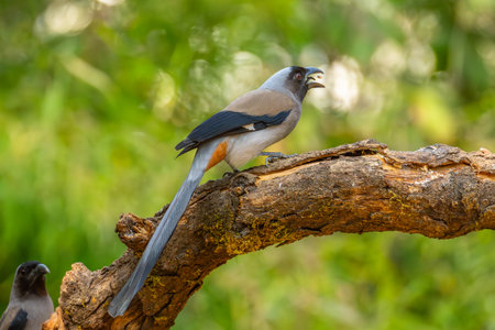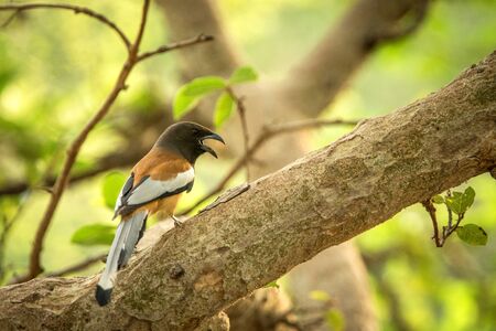 The rufous treepie (Dendrocitta vagabunda) sitting on branch in jungle, native to the Indian Subcontinent, wildlife bird photography, clear background, Ranthambore National Park, India