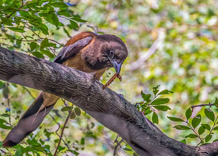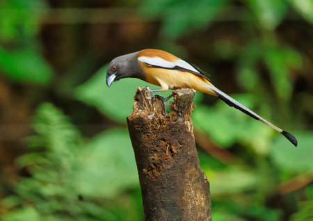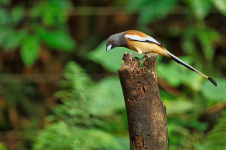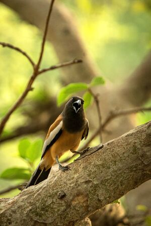 Rufous treepie or Dendrocitta vagabunda perches on branch in India