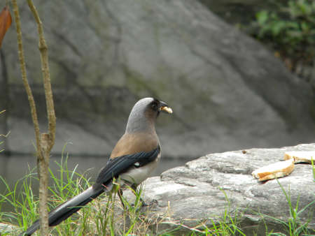 Close up shot of a Grey treepie eating a bread at Taipei, Taiwan