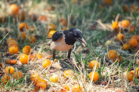 The rosy Starling (Sturnus roseus) stands on the grass among the fruits of cherry plum.