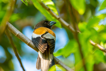 A vibrant bird perched gracefully on a branch, showcasing its striking plumage in a lush green environment.