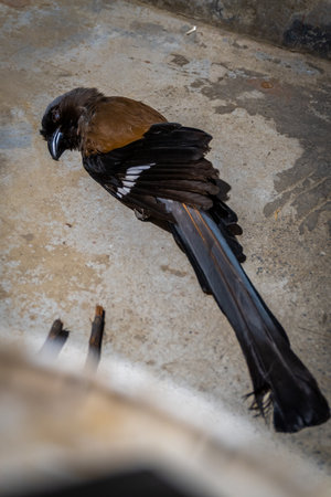 Dendrocitta formosae, or Grey Treepie, a medium-sized crow family bird, found fallen in its natural habitat.