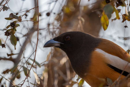A Rufous Sibia (Heterophasia capistrata), perched on a branch in the village of Pangot - Uttarakhand, in the north-east of India.