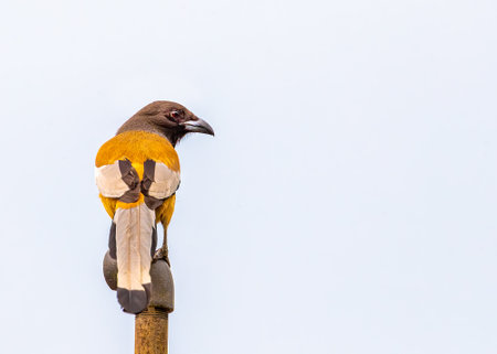 Watchful young common Magpie bird looking and perched on pole in tropical plantation