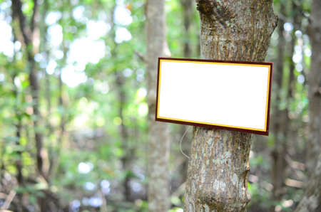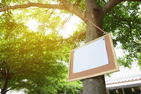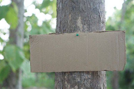 Blank paper card board for adding texts or words, sticked on trunk of tree. Concept, Sign and notice. Announcement. Giving information.