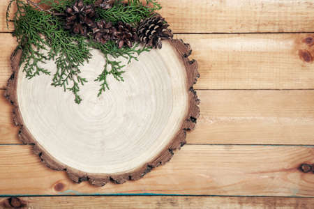 Spruce branches are laid out in form of circle, in the middle there is wooden round. Nearby is cone. New Years Christmas concept for postcard, banner. Gray background, copy space, minimalism, flat lay