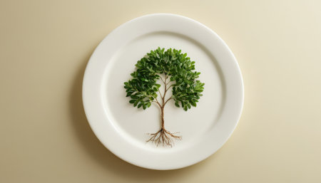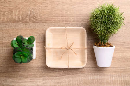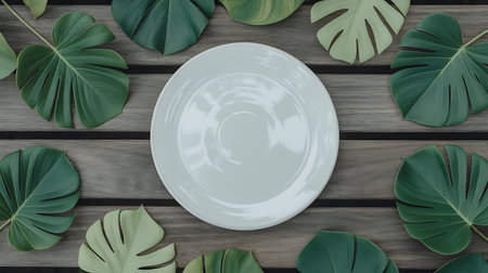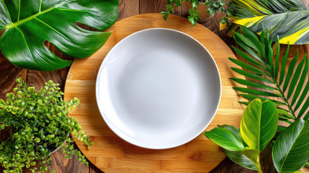 This image features an empty round plate on a wooden surface, surrounded by lush green leaves and tropical plants, perfect for culinary and decorative themes.