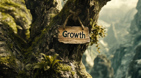 A rustic wooden sign displaying the word Growth hangs from a tree in a lush, tranquil forest setting. This image captures the essence of nature's beauty and the idea of renewal.