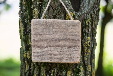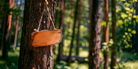 Rustic blank wooden sign tied to a tree with a rope, in a natural environment with a forest area in the background