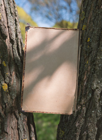 Vintage empty paper stands on green leaves of a plant near tree, creating a rustic and natural background. The weathered sheet blends with botanical foliage, offering an eco-friendly texture