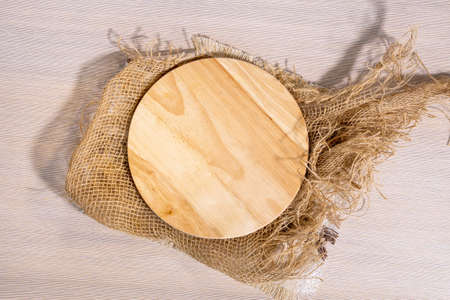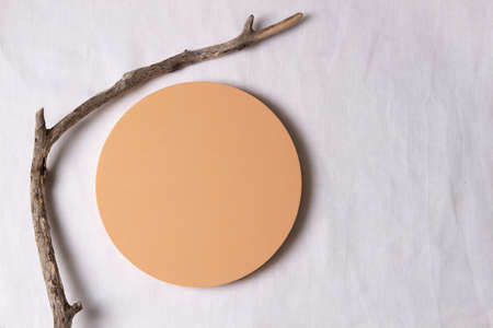 Empty round beige platform podium and dry tree twigs on white linen fabric background. Minimal creative composition background for cosmetics or products presentation. Top view
