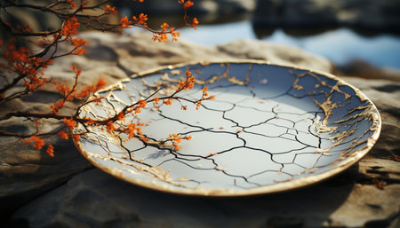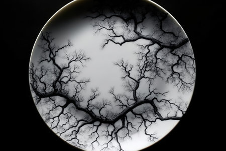 Handmade painted. Center of ceramic plate is hand painted by brown black abstract floral print. Branches stands vertically on the wooden surface on the grey color wall background. Generated AI