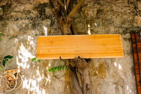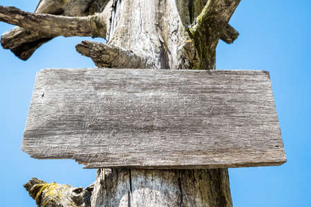 Rustic old wooden empty board hangs on tree offers empty copyspace
