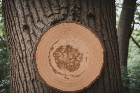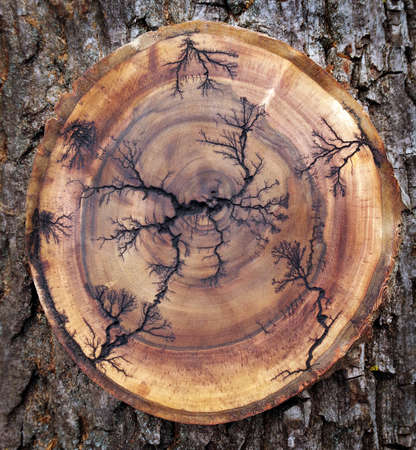 A polished cross-section of a tree shows rich, swirling wood grains and a natural, smooth finish.
