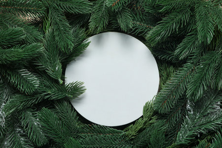 Frame of artificial fir tree branches and blank card, top view with space for text. Christmas decor