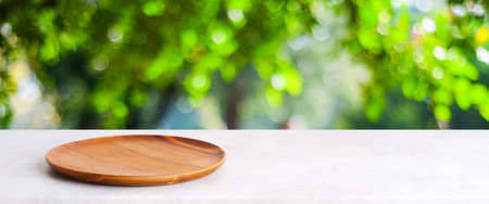Empty wooden plate on white table over blur green trees nature with bokeh background, Blank wood dish for food display montage banner template, muck up, poster, wallpaper
