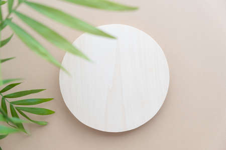 Natural round wooden stand for presentations and exhibitions on a green background with a hard shadow. An empty podium with green palm leaves in the background for an organic cosmetic product.