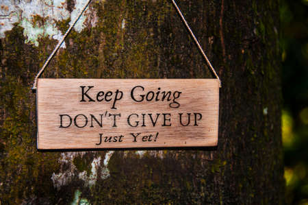Inspirational quote text on wooden banner - Keep going, don't give up. With tree and blurred nature background. Inspirational concept